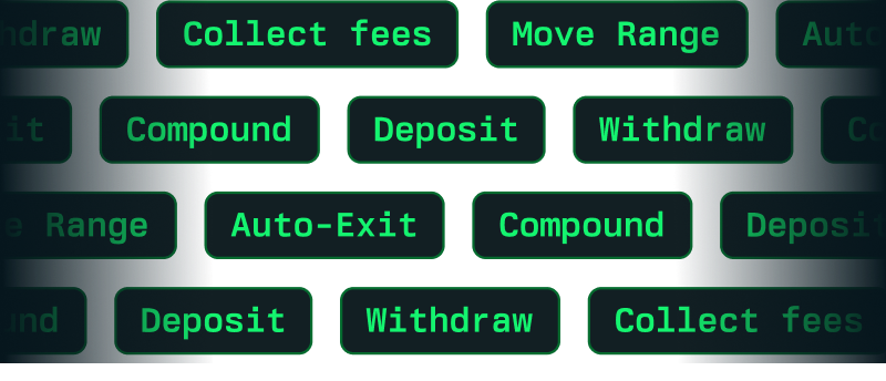 Manage all your LP positions with ease and automation from one trusty dashboard. Deposit, Withdraw, Collect, Move-Range, Auto-Exit, and Compound fees